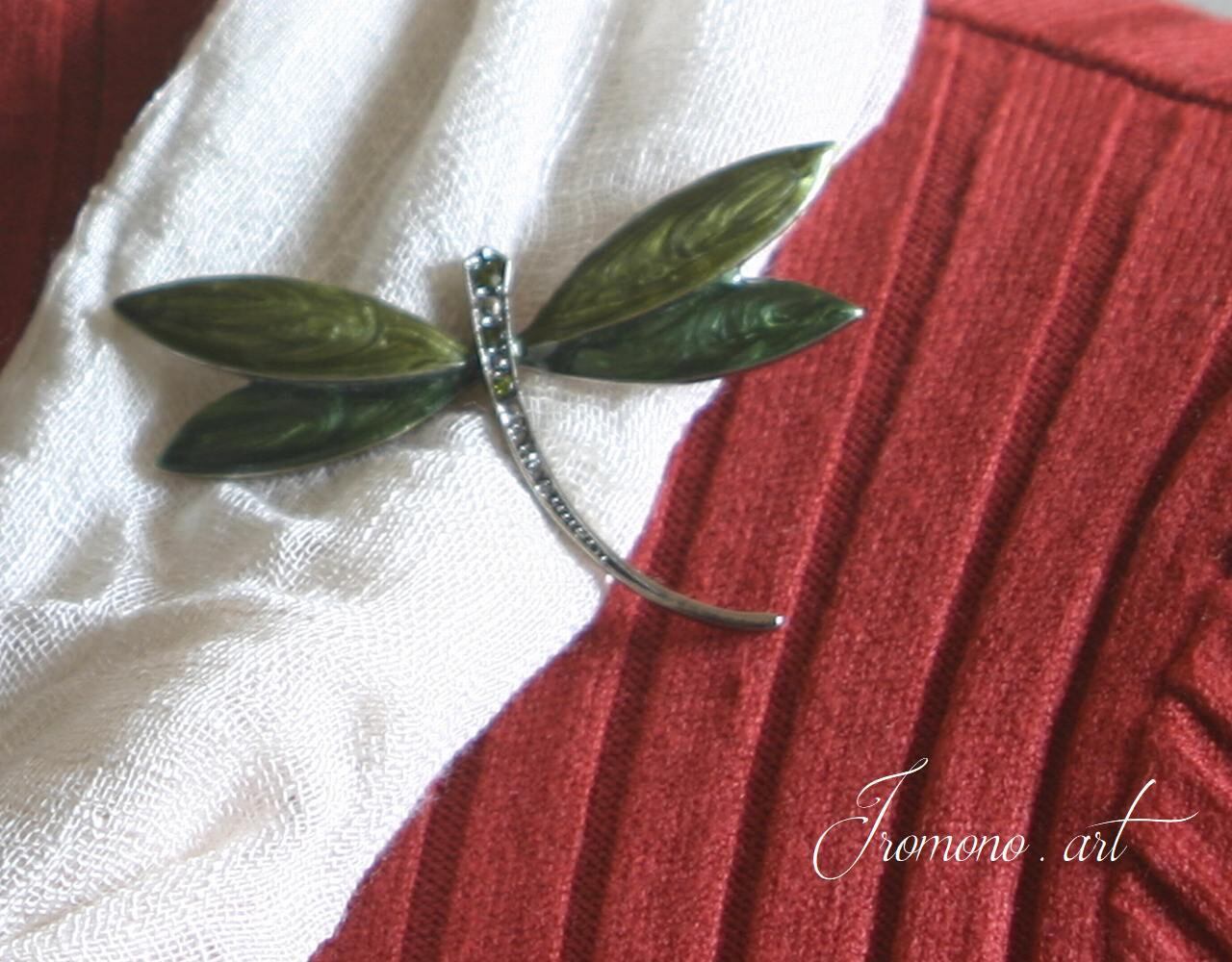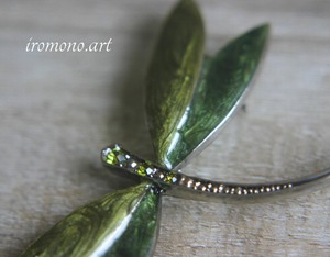 美しい深緑色のトンボブローチ。トンボには【良い変化の兆し】や【勝利】の意味をもっています。きれいな緑が優しいイメージをプラスしてくれます。