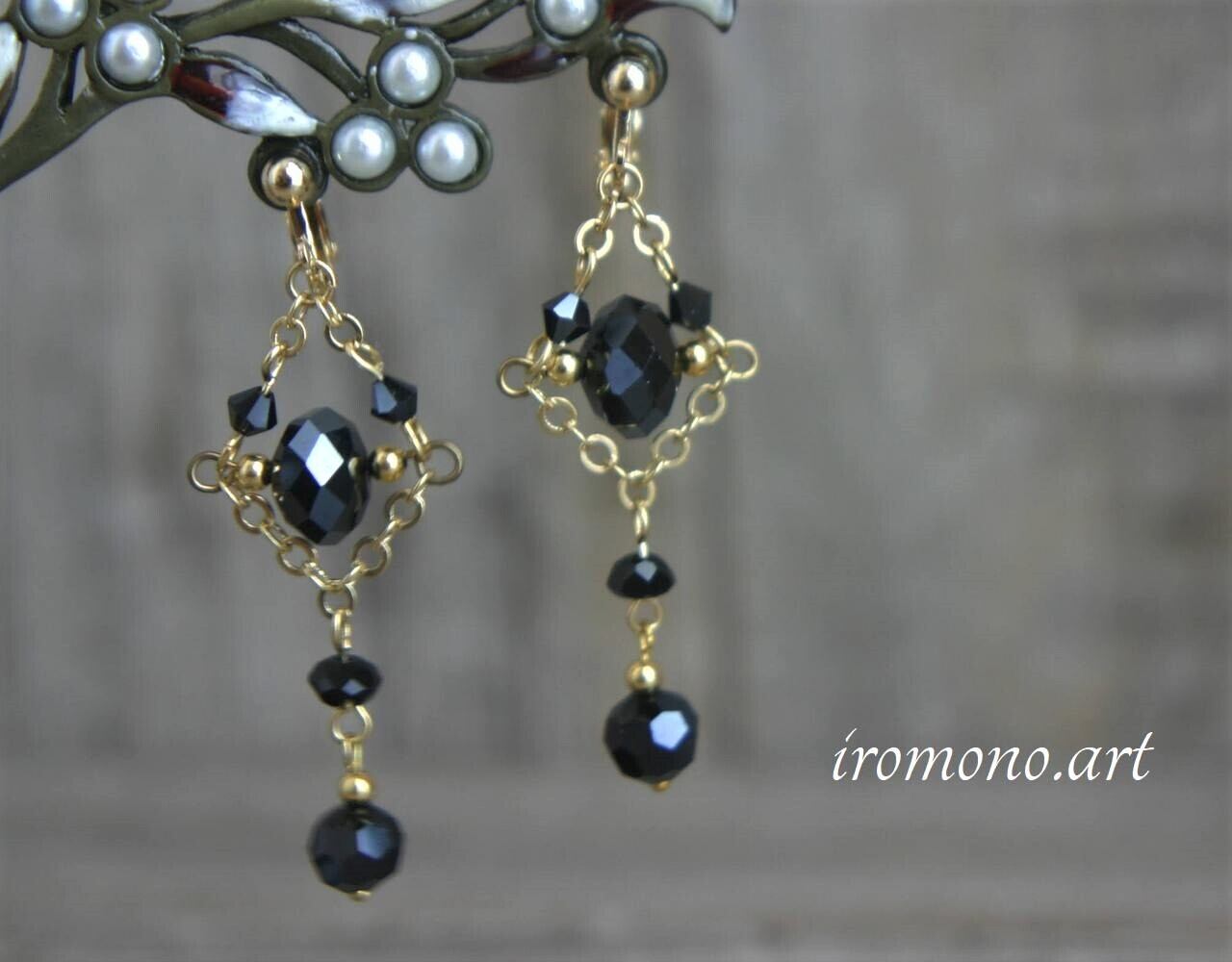 ゴールドのチェーンとブラックのスワロフスキーが輝く個性的なエレガントイヤリングです。